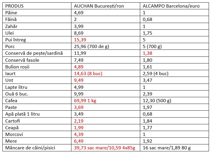 Dacă socotim 5 ron pentru 1 euro și diferențele de cantitate, majoritatea produselor sunt tehnic mai ieftine în București (le-am marcat cu roșu). Majoritatea, nu semnificativ mai ieftine, diferențe mici. Avantaj mai mare pentru produsele din România este în cazul cafelei (unde în România piața este mai diversificată), al iaurturilor (idem) sau al unor produse unde piața internă este covârșitoare, gen cartofi, ceapă, pui, ouă. Un caz aparte este al untului, unde prețul din București este semnificativ mai mic sau al mâncării de câine/pisică, explicația diferențelor de preț putând fi în calitate (ingrediente mai ieftine) sau pur și simplu în cerere, deoarece în Spania aproape nu există casă fără un animal sau mai multe.