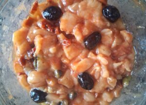 Am preparat circa 1 kg de piept de pui tăiat în bucăți mici, pe care l-am asezonat cu 10 g de sare și un praf de piper, iar ca și condiment aromatic i-am adăugat măsline, capere și câteva roșii uscate tăiate bucăți mici.