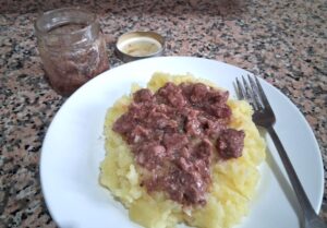 Am urmat apoi aceeași procedură în oala de presiune. A ieșit o carne de vită aromată și suculentă, ideală de asortat cu un piure simplu de cartofi și o salată verde.