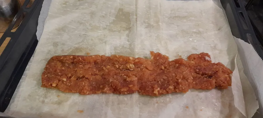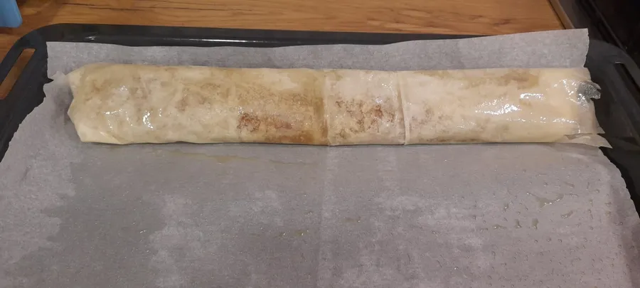 Se desface pachetul de foi de plăcintă și se acoperă cu o cârpă curată. Se stropește tava mare de la cuptor cu puțin unt topit sau ulei. Peste se întinde o foaie se unge și ea iar deasupra se pune o altă foaie. Desupra se întinde umplutură de măr (0 cincime din cantitate) orizontal, cam de grosimea a trei degete, în partea de jos a foilor, dar lăsând margini și jos și în lateral. Începeți să rulați de jos în sus foaia înfășurând astfel umplutura. Aveți grijă să introduceți în permanență marginile laterale în interior pentru a se forma un rolou perfect închis.