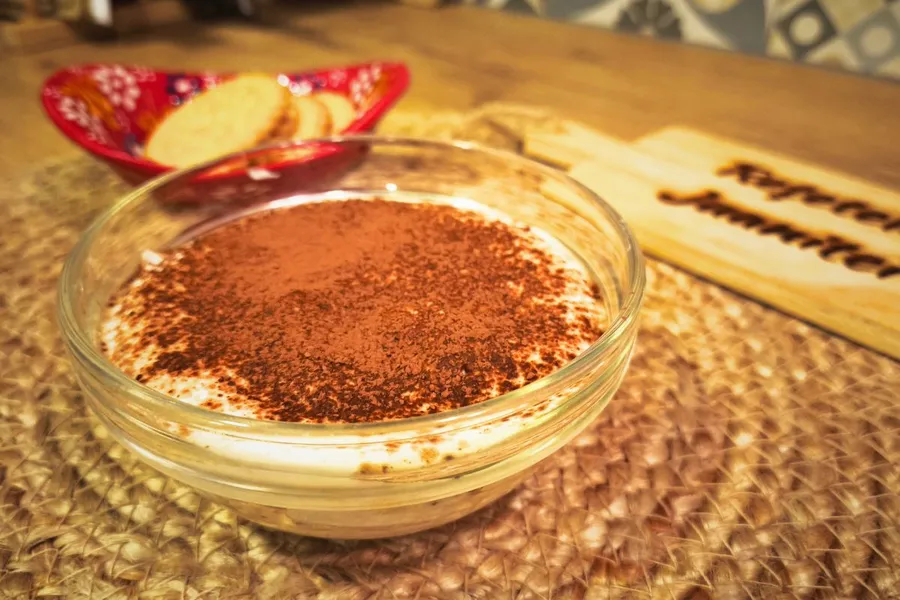 • biscuiți însiropați în cafea și cacao la suprafață, ca la tiramissu (rețeta din video);