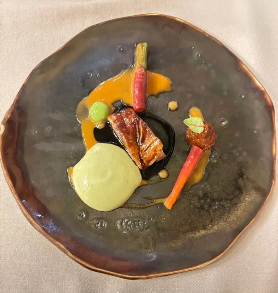 Caballa (un pește gras, de Mediterana) cu cremă de migdale și struguri, o sinteză între gustul mării și al roadelor de pe dealurile Cataloniei.