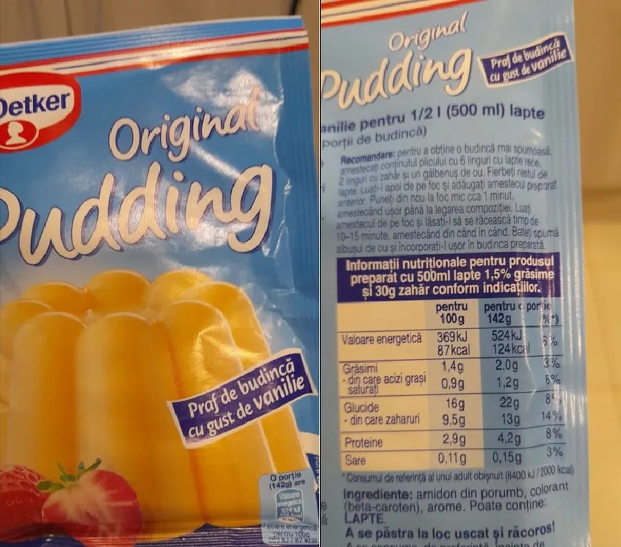 Budinca sau crema de vanilie se prepară din lapte, făină sau amidon, ou și zahăr. Te-ai aștepta să regăști aceste componente în conținut, să amesteci praful de amidon și ou cu lapte și zahar și să fierbi budinca. Să vedem ce conține în realitate. Amidon, colorant și aromă de vanilie. De ou nu a auzit. Deci va fi doar un lapte dulce cu amidon.