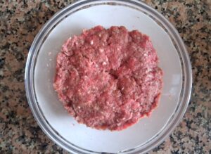 Dar ce punem, de facto, în ei? Cu ce completăm carnea tocată, ca să nu aibă gust ca de chiftele, ci gustul consacrat al unui hamburger? Diferența o face ceapa tocată foarte mărunt și adăugată în compoziția de carne. Pentru a mențile formula cât mai simplă, eu am mai adăugat doar puțin pesmet pentru a lega restul ingredientelor, sare și piper.