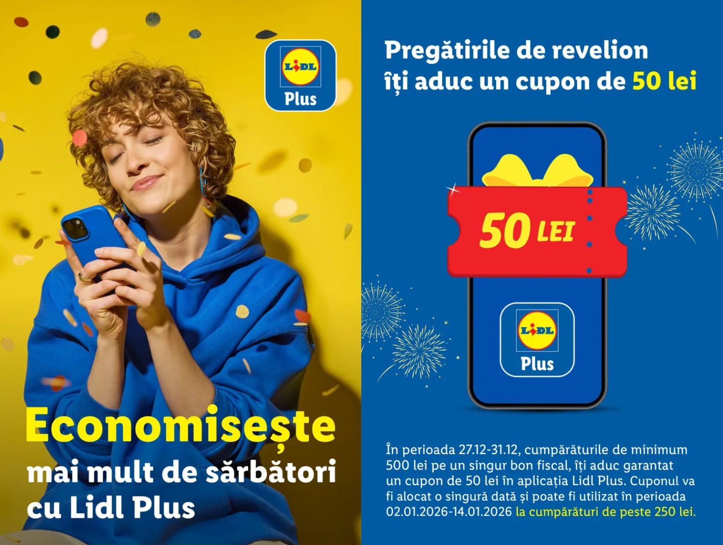 Pentru a recompensa cumpărăturile de final de an, Lidl România lansează o inițiativă dedicată clienților săi: în perioada 27–31 decembrie, cumpărăturile de minimum 500 de lei, realizate pe un singur bon fiscal, aduc garantat un cupon valoric de 50 de lei, alocat automat în aplicația Lidl Plus.