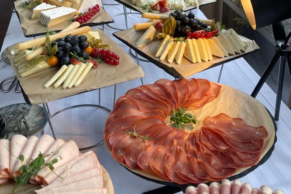 Mesele lungi, pline de bucate, arată foarte apetisant, iar varietatea produselor este considerabilă. Chiar dacă te hotărăști greu ce să alegi, poți să stai liniștit, că nu vei avea regrete: odată ce ai terminat farfuria, te poți duce s-o umpli din nou, cu preparatele care te ispitesc. Pe lângă platourile cu mâncare, copiii vor avea de ales dintr-o mulțime de dulciuri, prăjiturele, chec, dulcețuri dar și platouri întregi cu fructe și legume, pe alese.