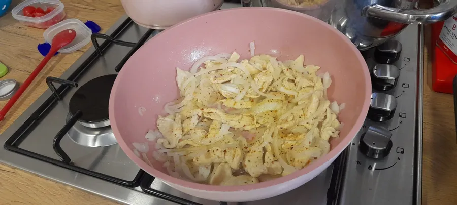 Eu am să vă dau rețeta mea. E o mâncărică gustoasă, ce se poate pune într-o tortilla pe care o cumpărați de la supermarket (e comod de luat și la pachet) sau o puteți mânca pe farfurie, normal.