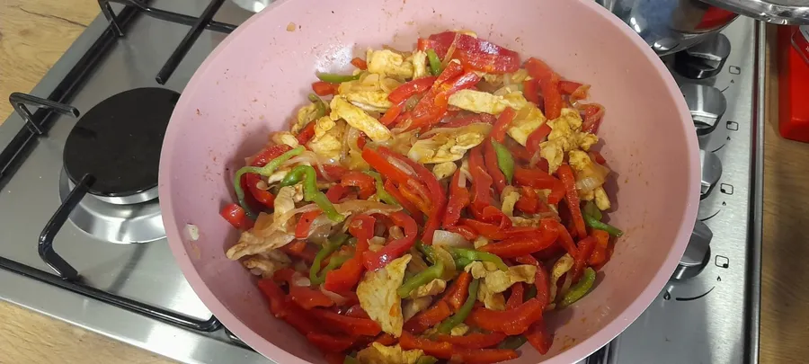 Încălziți teancul de tortillas la microunde un minut, puneți două-trei linguri de fajitas și împachetați strângând bine ca să nu curgă ingredientele. Îi puteți adăuga dupa gust sos roșii (ketchup), smântână, sos de avocado (guacamole).