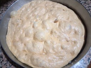 Acum transferăm aluatul în tava care va merge la cuptor și lăsăm să dospească a doua oară, acoperit cu folie de plastic și prosop. La fel, până la dublarea volumului și apariția bulelor de aer, care în realitate nu sunt de aer, ci de CO2.