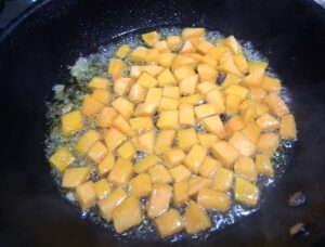În această fază, adăugăm deasupra, pentru a da o notă dulceagă în plus cuburi de aluat în două versiuni: jumătate crude, jumătate sotate 2-3 minute cu două linguri ulei de măsline și două linguri de zahăr.