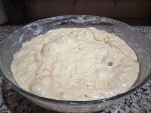 Începem prin a activa drojdia dizolvând-o în 4 linguri de apă și 1 linguriță de zahăr. Când începe să facă bule de aer preparăm cu ea un poolish, adică ceea ce în limbaj neprofesional numim maia din drojdie de bere: un preferment tipic aluaturilor realizați în doi timpi, în care folosin drojdia deja activată și care a început deja să fermenteze.
