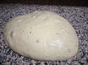 Acționăm aparatul sau continuăm manual până obținem un aluat bine definit și uniform. Îl lăsăm puțin pe blatul de lucru sau într-un bol mare uns cu ulei și executăm 2-3 plieri la intervale de 10 minute, înainte de a-l da la dospit. E gata când se își dublează volumul și la suprafața sa încep să se formeze bule vizibile.