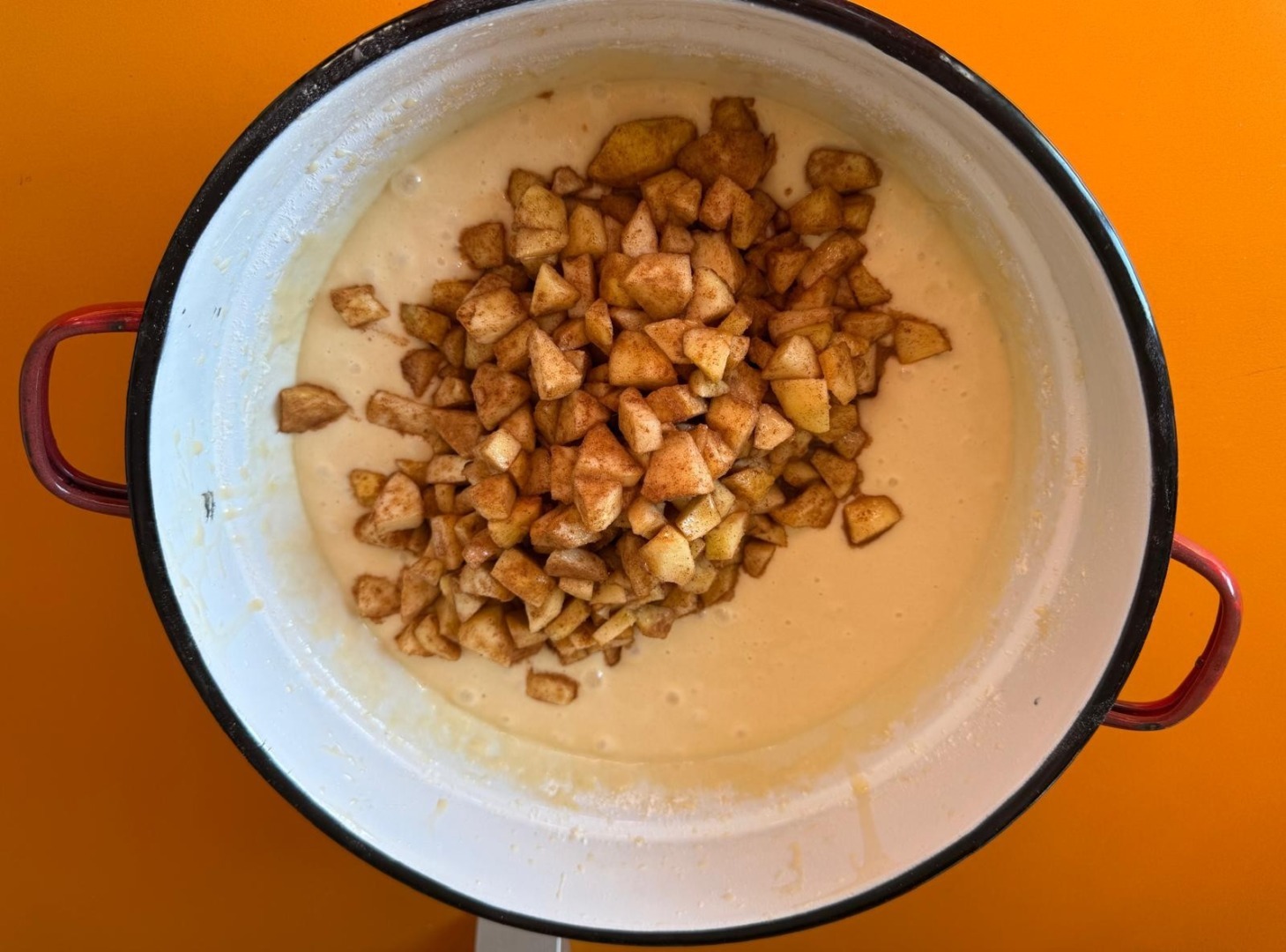 La final, adăugăm cubulețele de mere în aluat. Eu păstrez câteva cubulețe pentru a le pune pe deasupra. Nu e doar pentru aspect, ci are și un rol de a face ca merele să se așeze uniform în aluat. Asta pentru că cele amestecate deja, vor avea tendința să se lase la fundul tăvii. Cele care au fost puse pe deasupra însă, vor rămâne în partea de sus a aluatului.