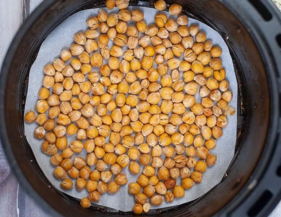 Puneți o bucată de hârtie de copt în airfryer. Răspândiți năutul în coș păstrându-l într-un singur strat. Setați aparatul la 200 de grade C și lăsați năutul să se prăjească timp de 15-20 de minute. Consumați după cel puțin 15 minute.