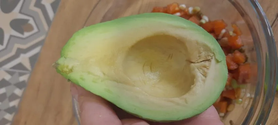 Avocado trebuie să fie copt, moale, iar când îl tăiați să aibă o culoare verde frumoasă. Dacă aveți o formă din aceea rotundă pentru un plating mai profesional, va arata mai bine. Eu n-am găsit-o pe a mea. Merge cu câțiva crackerși sau 1-2 feliuțe de pâine prăjită. Se consumă imediat pentru ca avocado să nu se oxideze.