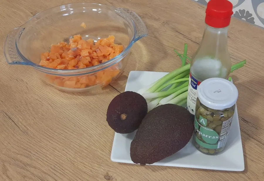 Se curăță somonul de piele, dacă are, se taie în cuburi de dimensiunea unghiei mici. La fel și avocado. Se toacă fin partea albă din ceapă, caperele și ardeiul iute foarte, foarte marunt. Se amestecă toate într-un castron, iar deasupra se pun sosul de soia, zeama de lămâie, piperul și coriandrul.