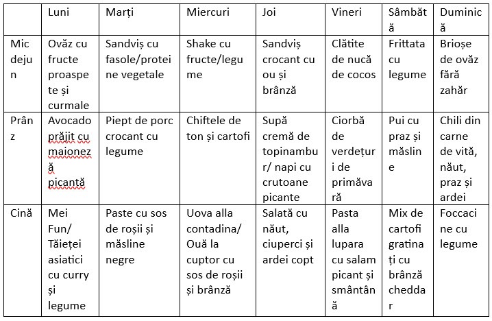 Dar pe lângă acest tip de organizare ai nevoie și de o planificare a meniului săptămânal. Te va ajuta și la întocmirea listei de cumpărături și la buna gestionare a timpului (și nervilor) tăi și vei economisi și niște bani.