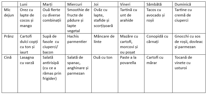 Mai jos aveți meniul pe care vi-l propunem pentru săptămâna 17-22 noiembrie. E un meniu orientat mai mult pe vegetale pentru a oferi variante de preparate de post sau din cele ovo-lacto-vegetariene, cu legume, ouă și lactate, brânzeturi, pește.