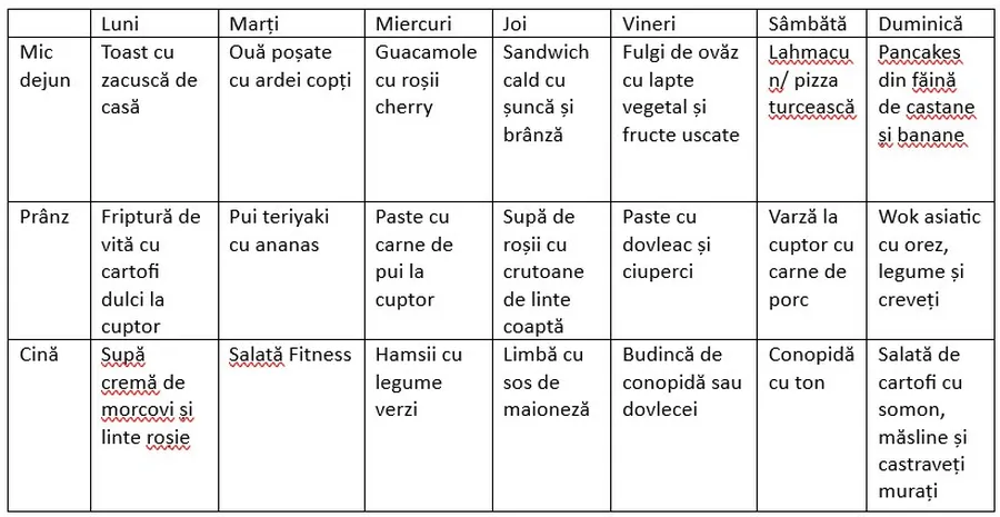 Mai jos aveți meniul pe care vi-l propunem pentru săptămâna 27 octombrie – 2 noiembrie.