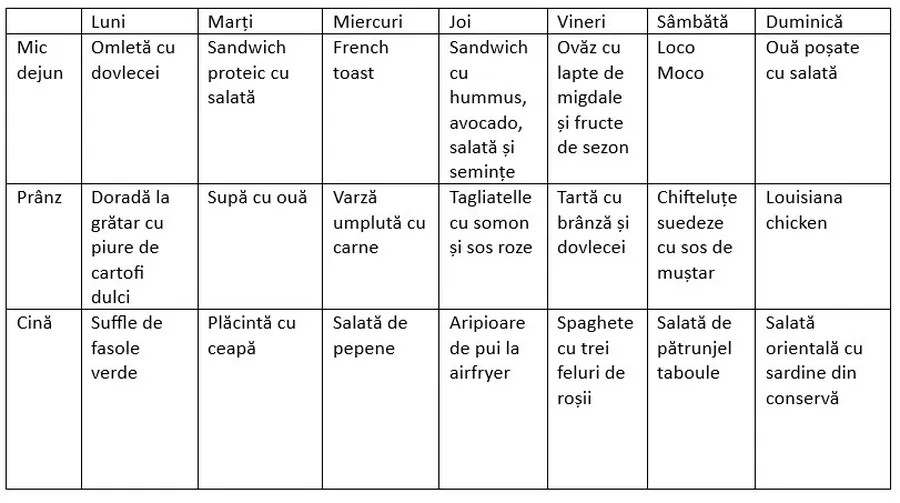 Dar pe lângă acest tip de organizare ai nevoie și de o planificare a meniului săptămânal. Te va ajuta și la întocmirea listei de cumpărături și la buna gestionare a timpului (și nervilor) tăi și vei economisi și niște bani.