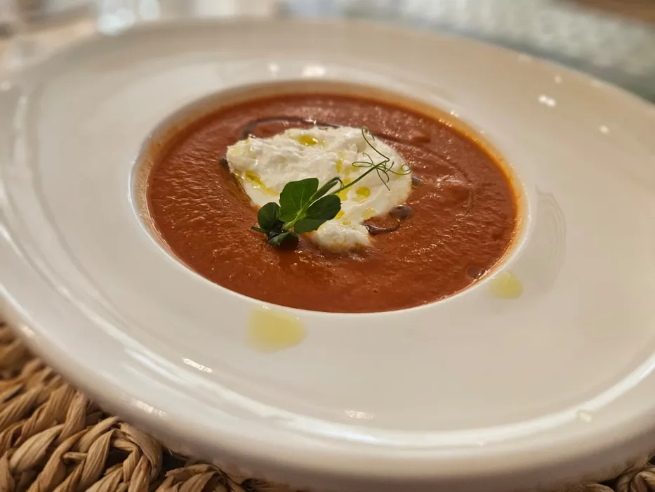 FOTO | Supă picantă de roșii cu burrata / Deasupra se adaugă câteva picături de ulei de măsline