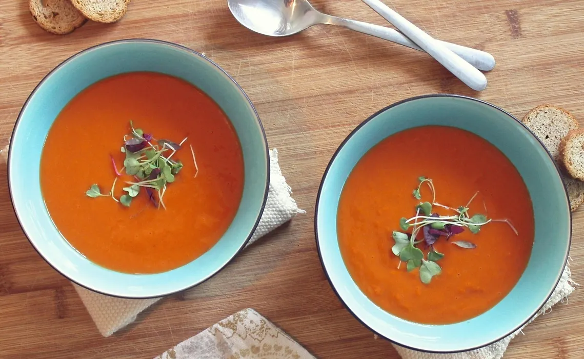 FOTO | Supă picantă de roșii cu burrata / Deasupra se adaugă câteva picături de ulei de măsline