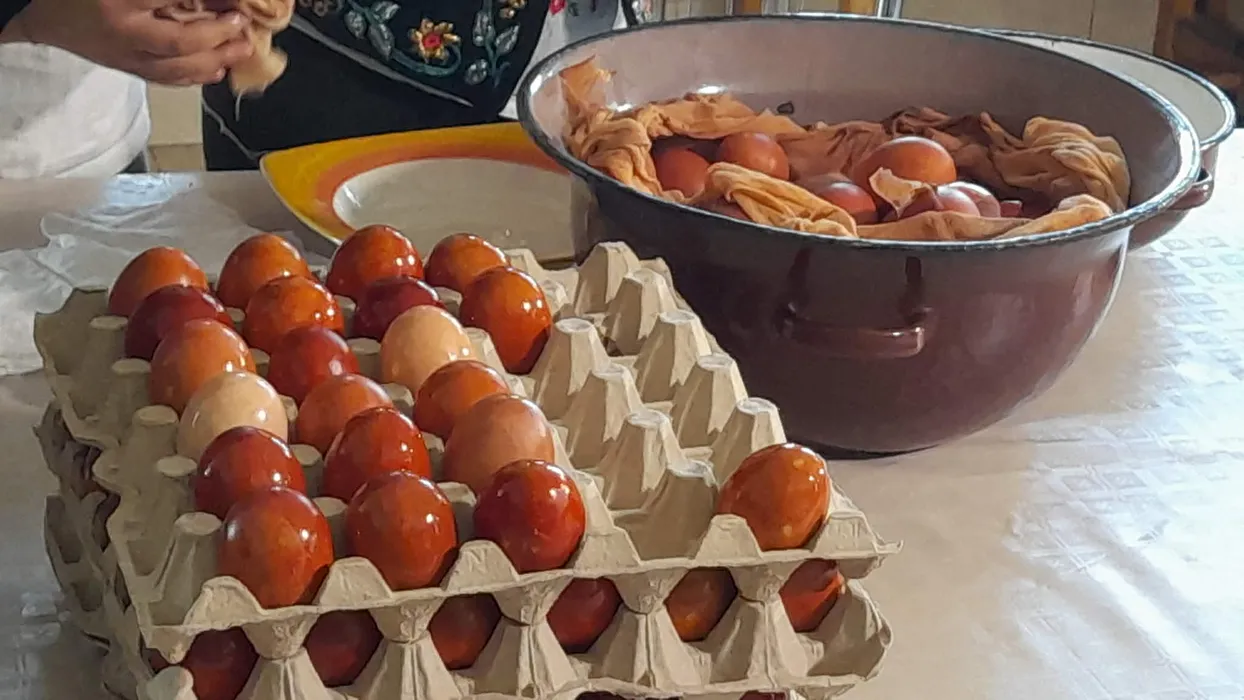 FOTO-VIDEO | Tradiție la Mănăstirea Timișeni / Peste 1.000 de ouă din gospodăria proprie sunt vopsite eco, folosind coji de ceapă roșie și albă