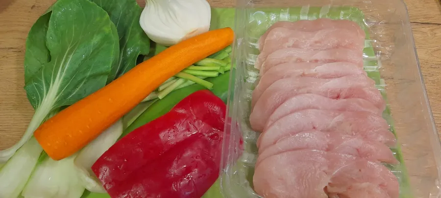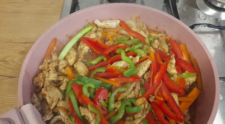 Am tăiat carnea în fâșii subțiri, ceapa în rondele, legumele în bastonașe. Se pun în tigaie câteva linguri de ulei de măsline și, daca aveți, două linguri de ulei de susan, carnea, ceapa, morcovii și condimentele. Daca aveți varză puneți-o tot acum tăiată fideluță subțire. Se prăjesc la foc rapid câteva minute, se pun 5-6 linguri de sos de soia și se continuă gătirea până când carnea este aproape gata. Se adaugă frunzele de bok choy tăiate fâșii. Legumele trebuie să rămână crocante, iar carnea să fie gătită.