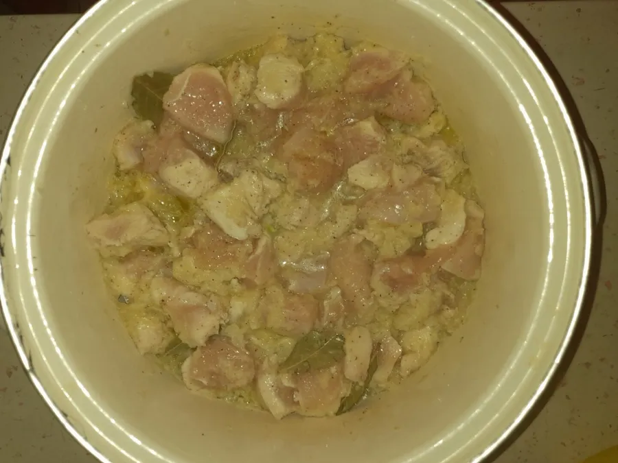 Ceapa se taie mărunt sau se dă pe răzătoare și se pune la călit în puțin ulei. Puiul se taie cubulețe, se condimentează cu sare, piper, un pic de boia și praf de usturoi și se adaugă peste ceapă. Tot acum se pune și dafinul. Se adaugă apă cât să acopere totul cam de două degete și se lasă să se înăbușe, sub capac, la foc mic. Nu vă temeți să puneți ceva mai multă apă, găluștile vor absorbi din sos.