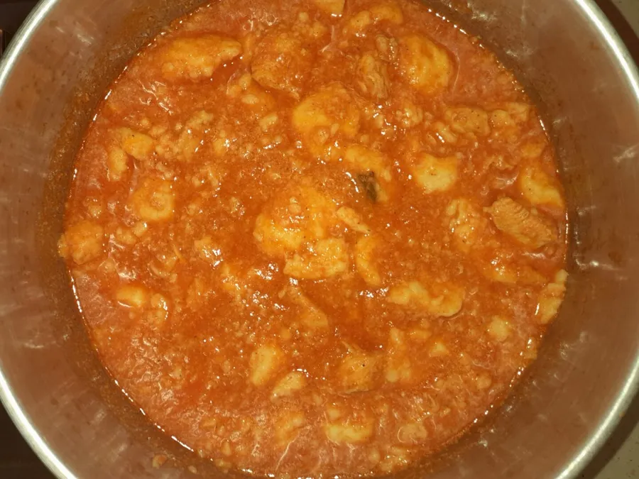 Când carnea este aproape fiartă, se adaugă trei linguri de bulion, sare, boia dulce și iute, piper, după gust. Se lasă să fiarbă în continuare la foc minim.