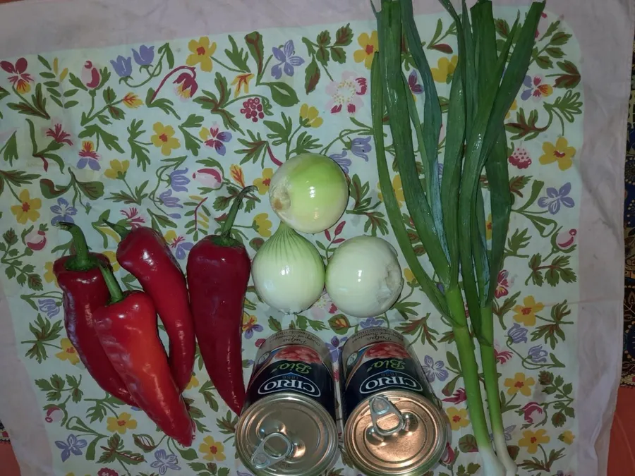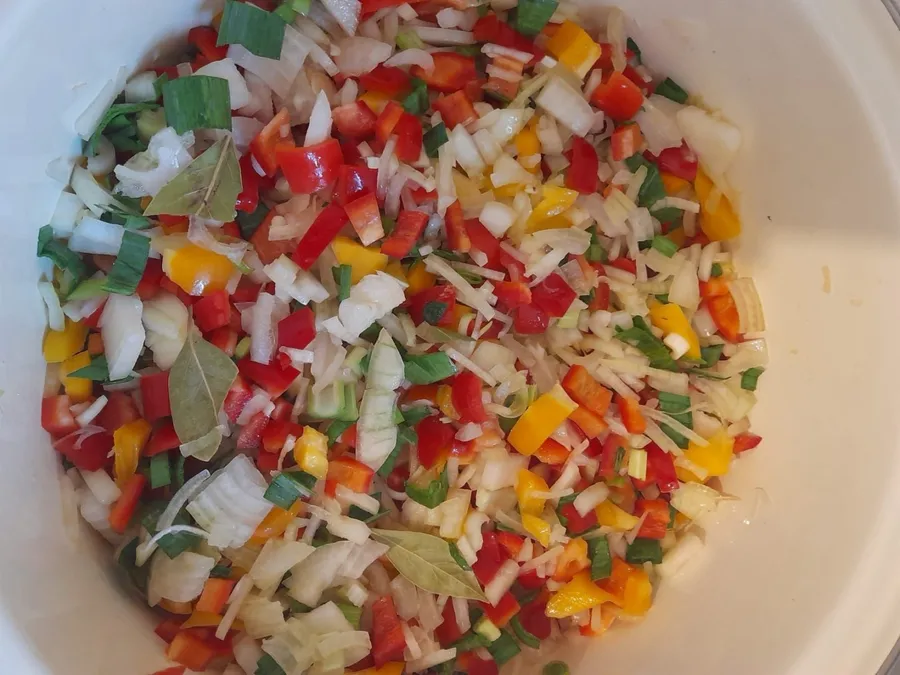 Separat, se taie mărunt toate legumele. Se călesc într-o oală încăpătoare, în ulei de măsline, mai întâi ceapa, ardeii, usturoiul şi dafinul, cu puţină sare. Când acestea sunt înmuiate bine, se adaugă şi roşiile cubuleţe, cele două linguri de bulion, sarea, zahărul (2 linguriţe), piperul şi vinul. Se mai lasă să clocotească 10 minute şi se introduce uşor în oală peştele prăjit, bucată cu bucată, având grijă să nu îl rupem.
