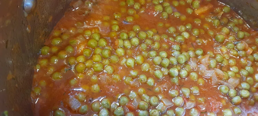 Se taie ceapa tăiată mărunt și boiaua, se călesc în uleiul încins până ceapa e aurie. Se stinge totul cu supă (nu multă, cât să nu se ardă ceapa). După 10 minute se pun mazărea și bulionul, sare, piper și se mai fierb câteva minute. Lichidul să fie scăzut, nu e ciorbă. Când am stins focul punem și jumătate de legătură de mărar tăiat foarte fin. Atenție cu sarea, căci jamonul conține destulă.