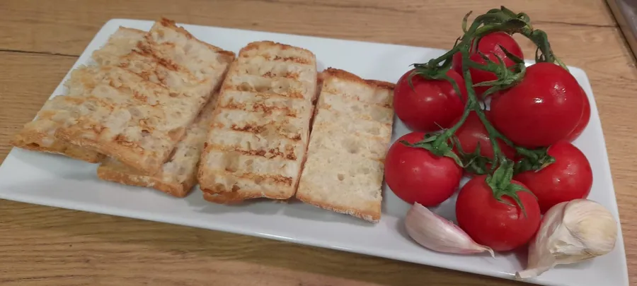 Pâinea cea mai bună pentru pan con tomate este o pâine aerată, asemănătoare ciabattei italiene. În Spania îi spunem pan de coca. Dar evident, orice pâine e bună. O tăiem și o punem puțin pe grill. După, felia de pâine caldă se freacă bine cu un cățel de usturoi, apoi cu o jumătate de roșie mică, dulce și zemoasă. Deasupra merge un pic de sare (dacă avem din aceea sub formă de fulgi e și mai bună) și un ulei de măsline din cel mai virgin.