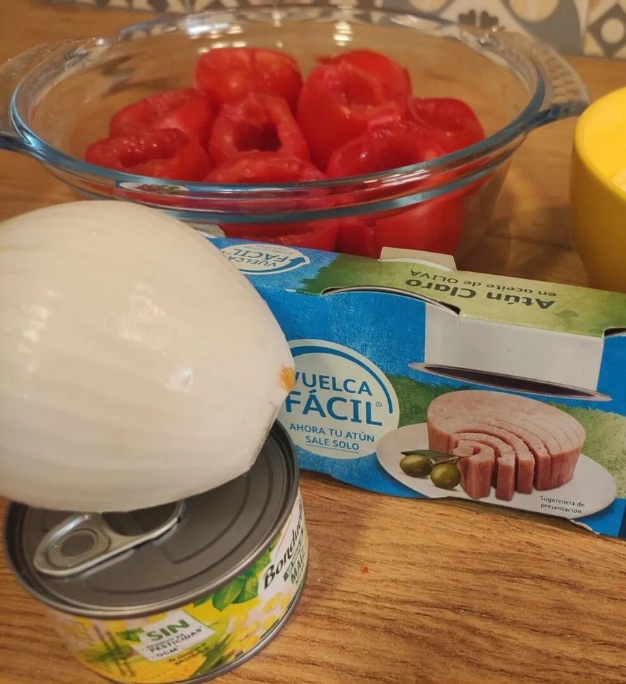 Se scoate miezul roșiilor ca în imagine. Se scurge apa din conserva de porumb și uleiul din conservele de ton (nu complet). Într-un castron destul de mare se zdrobește tonul cu furculița. Se taie ceapa și ridichile foarte mărunt. Se amestecă toate ingredientele.