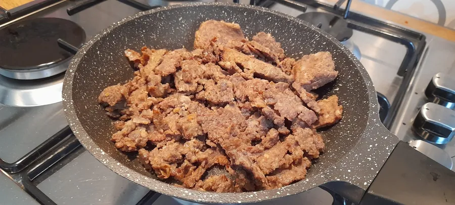 Punem carnea într-o tigaie încinsă cu puțin ulei. Carnea de vită se frige la foc mare și timp foarte scurt. Trebuie amestecată permanent pentru a nu se arde.