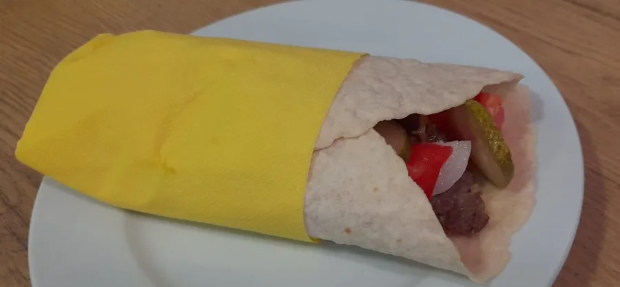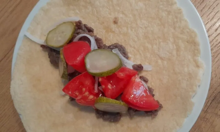 Carnea, cartofii, salata de varză și restul ingredientelor se distribuie uniform pe zona de mijloc, în sens vertical, lăsând spațiu la margini. Astfel vom putea îndoi marginea de jos și compoziția nu va curge din lipie.