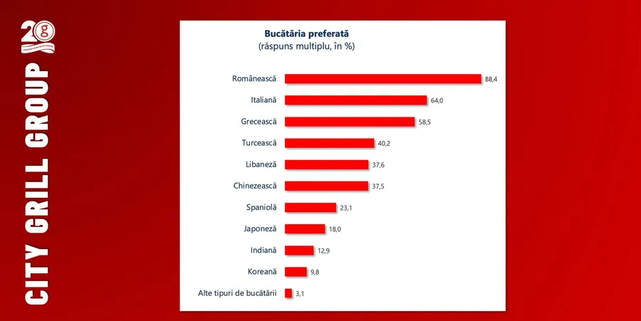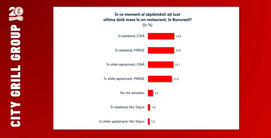 Grupul City Grill, cel mai important grup românesc de restaurante de pe piața locală, a anunțat, la aniversarea a 20 de ani de activitate în domeniul ospitalității în România, rezultatele unei cercetări sociologice desfășurate în luna aprilie despre obiceiurile culinare ale bucureștenilor. Potrivit analizei, publicul se distribuie aproape egal între weekend și zilele săptămânii, dar și în funcție de momente ale zilei. Procente similare indică faptul că respondenții au ieșit ultima dată la restaurant pentru cină în weekend (23,8%), prânz în weekend (23,6%), cină în timpul săptămânii (23,1%) sau prânz în timpul săptămânii (21,6%). Bucătăriile preferate de bucureșteni sunt: românească, grecească și turcească.