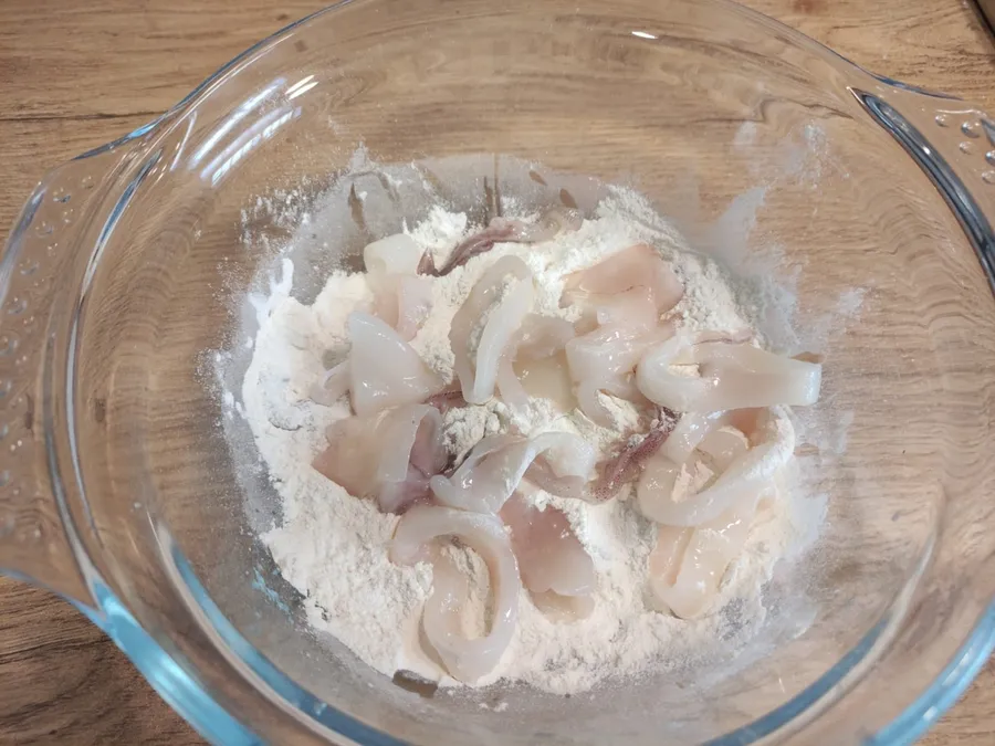 Calamarii, dacă sunt proaspeți, se curăță, se taie în rondele nu mai groase ca lățimea degetului mic și se tamponează cu un șervețel. Dacă nu găsiți proaspeți puteți lua și din cei congelați de la supermarket. Îi decongelați și urmați aceiași pași. Iar dacă găsiți proaspeți, faceți ca mine și rugați vânzătorul să-i curețe.
