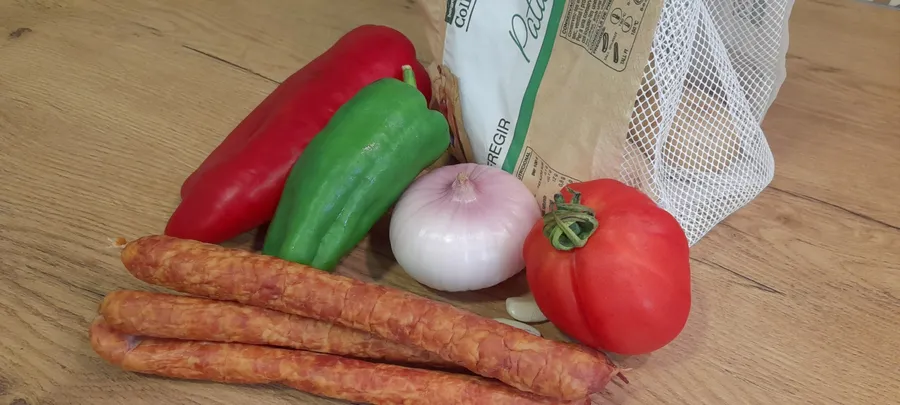Separat într-o tigaie se prăjesc bucățelele de cârnați și la final se adaugă atât cârnații cât și grăsimea rezultată din prăjirea lor la guiso. Eu am pus cârnați românești că cei spanioli sunt cam fără gust, după părerea familiei mele. Presărați deasupra jumătate de legătură tocată de pătrunjel. Merge cu o salată de roșii de vară, mari și coapte și cu puțin ulei de măsline deasupra. Și alături câteva felii de pan con tomate pentru sos.