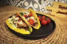 - Dacă găsiți tacos, lipii din cele mici, le puneți 10 minute în cuptorul încins la 180 de grade chiar pe grătar să ia o formă de U. Ca în fotografie. Eu le-am cumpărat gata făcute și îndoite din producție, că sunt în Spania și aici ai mai multe opțiuni. Dacă nu găsești așa, iei tortilla obișnuită, o tai pe jumătate și o pui la cuptor să ia formă de tacos.
