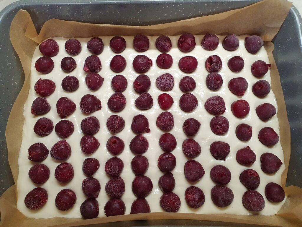După ce au fost adăugate toate ingredientele, compoziția se toarnă într-o tavă tapetată cu hârtie de copt. Într-o tavă de 26×34 cm, stratul va avea aproximativ 1 cm grosime. Deasupra puneți fructe din belșug.